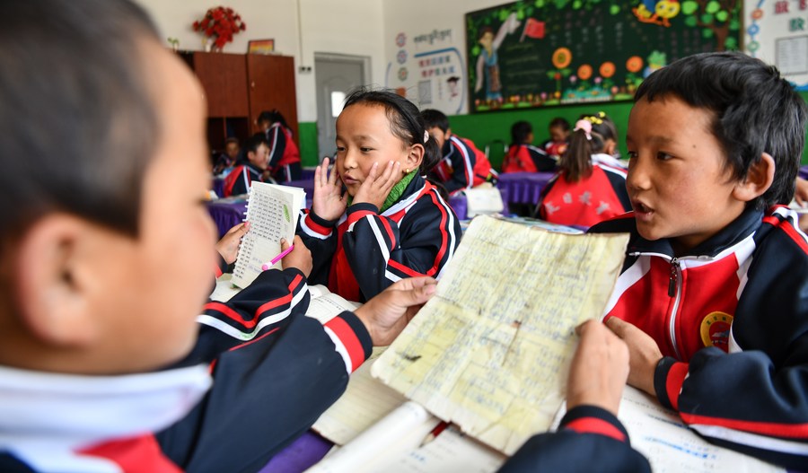 扎西宗鄉(xiāng)完全小學的學生在上藏文課(6月5日攝)。