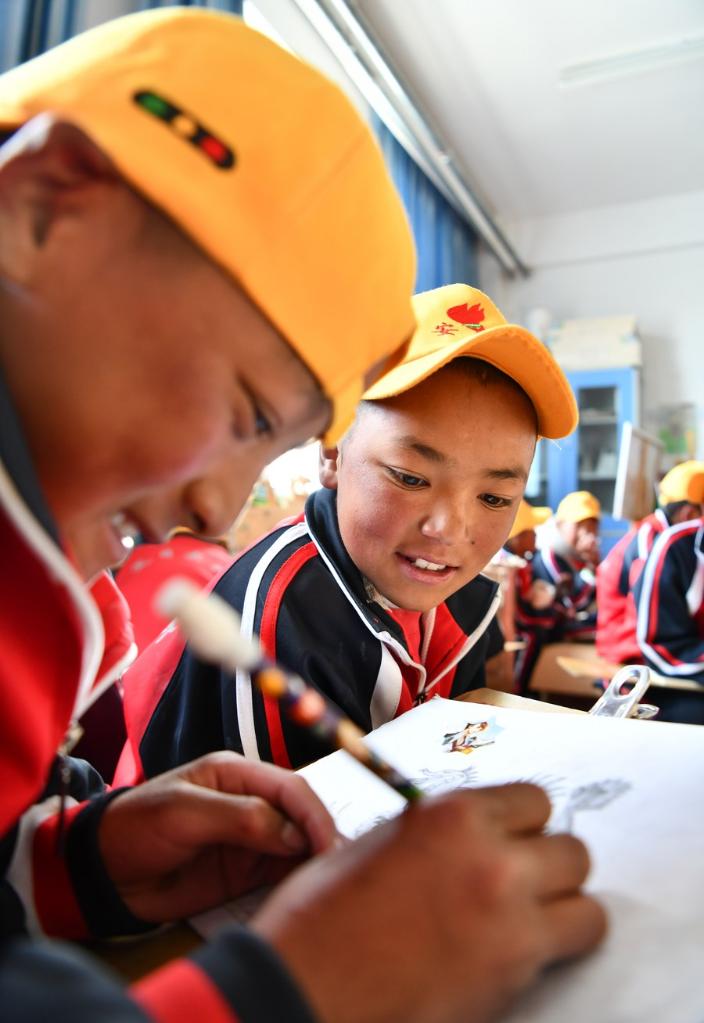 6月5日,扎西宗鄉(xiāng)完全小學的學生在上美術課。