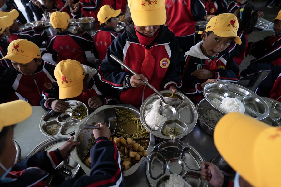 6月5日,扎西宗鄉(xiāng)完全小學的學生在食堂吃午飯。
