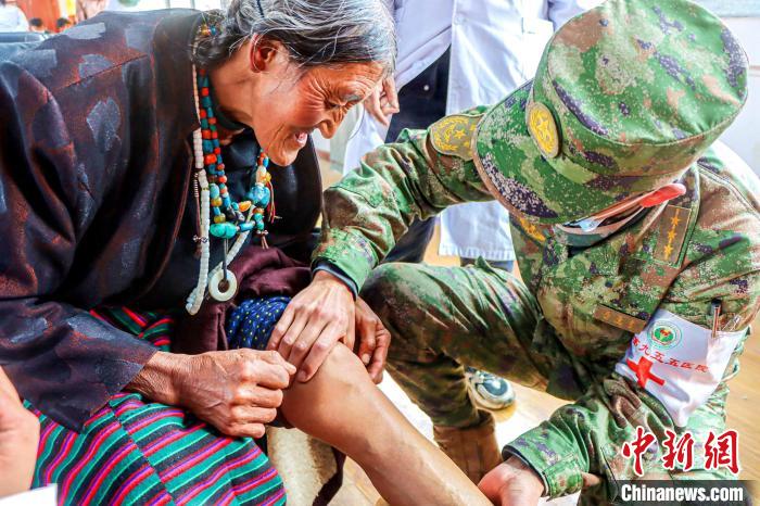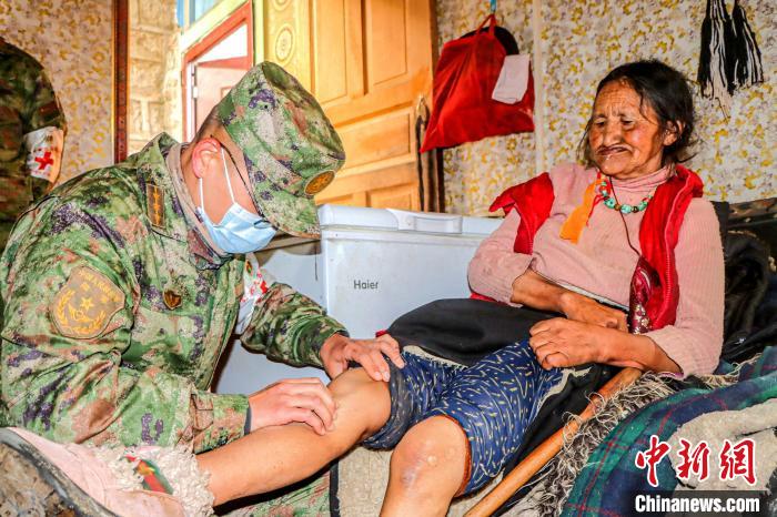 圖為醫(yī)療隊(duì)軍醫(yī)來到格桑措姆老人的家中為她檢查膝蓋疼痛問題?!≈煳男?攝