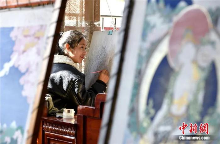 索朗次旺在西藏拉薩繪制唐卡。隨著社會的發(fā)展,越來越多的西藏女性學(xué)習(xí)唐卡繪畫。李林 攝