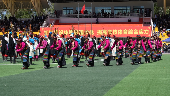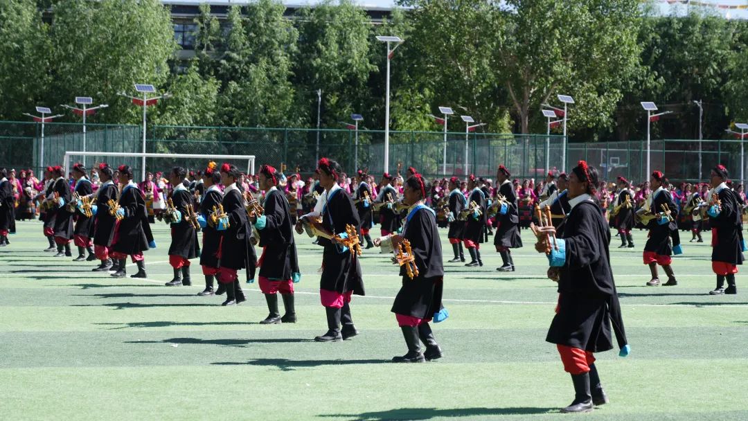 伴隨場上一陣強勁有力的鼓點響起,來自各縣的演員身著節(jié)日盛裝,堆諧、洛諧、司馬卓等民間歌舞風格獨特、歷久彌新,在幾層大半圓橫排式的流動陣型中慢慢變換成太陽、月亮、滿天星等陣型。