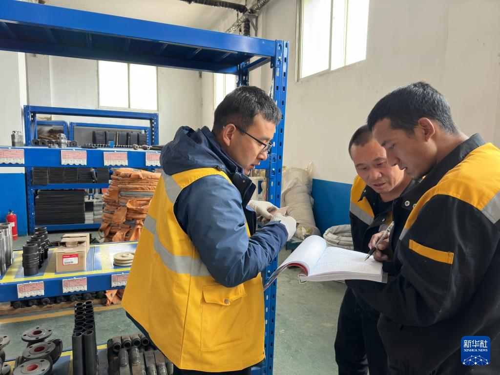高錢(qián)勝(左一)和同事在材料庫(kù)核對(duì)應(yīng)急搶險(xiǎn)備品。受訪者供圖