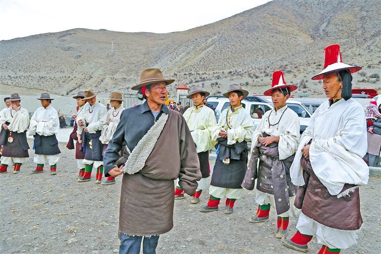 “小時(shí)候,我看見(jiàn)大人們?cè)诓莸厣咸疅嵴袂俊枳颂亮?。我不想我的后代只能在?shū)本里看到這個(gè)舞蹈,希望把它傳承下去?!?6歲的宗巴為了恢復(fù)“熱振曲卓”表演,于2015年成立了林周“熱振曲卓”傳播有限公司,致力于該舞蹈的傳承保護(hù)。