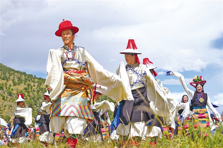 “熱振曲卓”文藝演出隊(duì)女演員表演舞蹈。