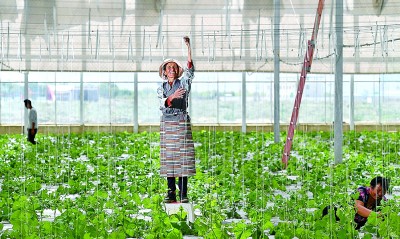 工作人員在山南市扎囊縣阿扎鄉(xiāng)的玻璃溫室里養(yǎng)護(hù)旗云瓜。湖南省第九批援藏工作隊(duì)引進(jìn)智慧農(nóng)業(yè)和戈壁田園植物工廠項(xiàng)目,在荒地建起有機(jī)果蔬基地200多畝。攝影:辜鵬博(湖南日?qǐng)?bào)攝影記者)