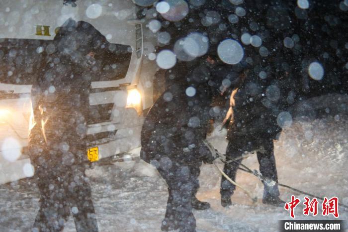 來到現(xiàn)場后楊軍發(fā)現(xiàn),該路段積雪超過半米深,車輛已經(jīng)深陷其中無法行駛。楊軍立即組織民警用鐵鍬鏟雪、人力助推、繩索牽引等進行施救,經(jīng)過一個多小時的努力,成功將部分被困車輛救出??涩F(xiàn)場風(fēng)雪突然變大,下雪速度遠(yuǎn)超過救援速度,轉(zhuǎn)眼間,路面積雪接近1米高,到深夜時,雙向車道上被困車輛、人員已達(dá)17輛、49人,看到情況越來越嚴(yán)峻,楊軍迅速對接、協(xié)調(diào)駐地交通部隊共同開展救援。