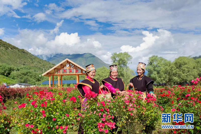 圖為當(dāng)?shù)卮迕裨诠げ蓟ü让倒宸N植園內(nèi)采摘玫瑰花朵。 (工布花谷 李磊 供圖)