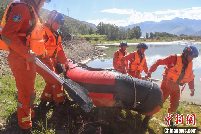 圖為演練現(xiàn)場(chǎng)進(jìn)行舟艇救援。西藏自治區(qū)森林消防總隊(duì)拉薩市大隊(duì) 供圖