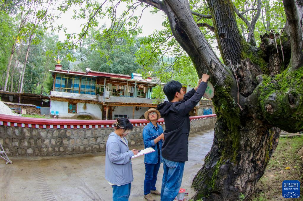 劉利平博士(右一)在加查縣安繞鎮(zhèn)熱果村一株樹(shù)齡1800余年的古核桃樹(shù)下指導(dǎo)學(xué)生(7月27日攝)。新華社記者 姜帆 攝
