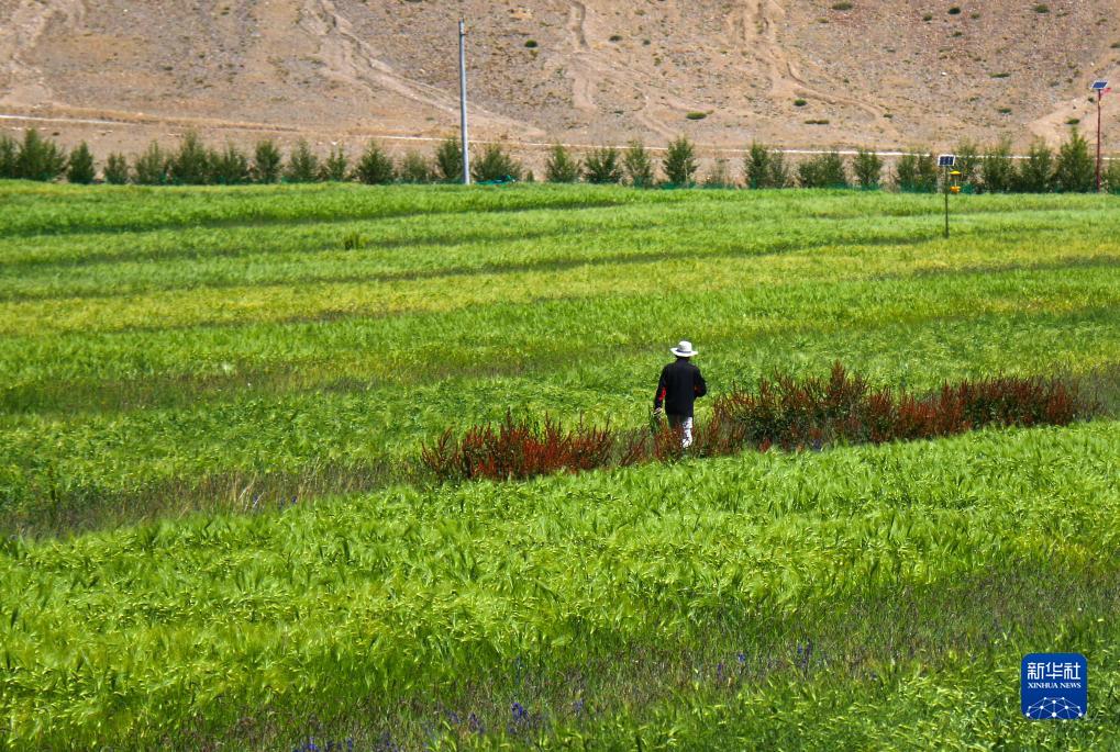 8月12日,西藏阿里地區(qū)普蘭縣赤德村村民在一片青稞田里行走。新華社記者 聶毅 攝
