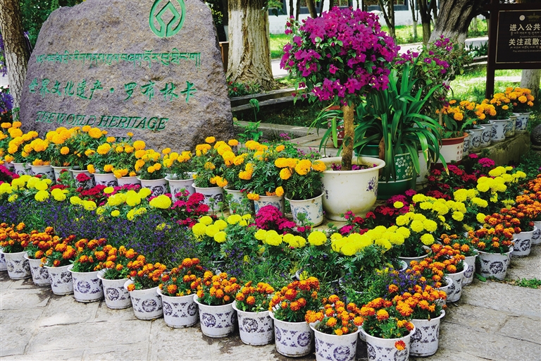 雪頓節(jié)除了看藏戲、賽馬等傳統(tǒng)表演之外,人們也喜歡到羅布林卡觀賞花卉。近期,記者走訪羅布林卡時(shí)發(fā)現(xiàn),園內(nèi)花團(tuán)錦簇、游人如織,大部分宮殿及人流量較大的道路上已擺放好了盆栽。園區(qū)道路間擺放的盆栽花卉主要有繡球花、萬(wàn)壽菊、金魚草、波斯菊、高雪輪、麥稈菊等,而宮殿前擺放的花卉主要有一品紅、繡球花、萬(wàn)壽菊等。