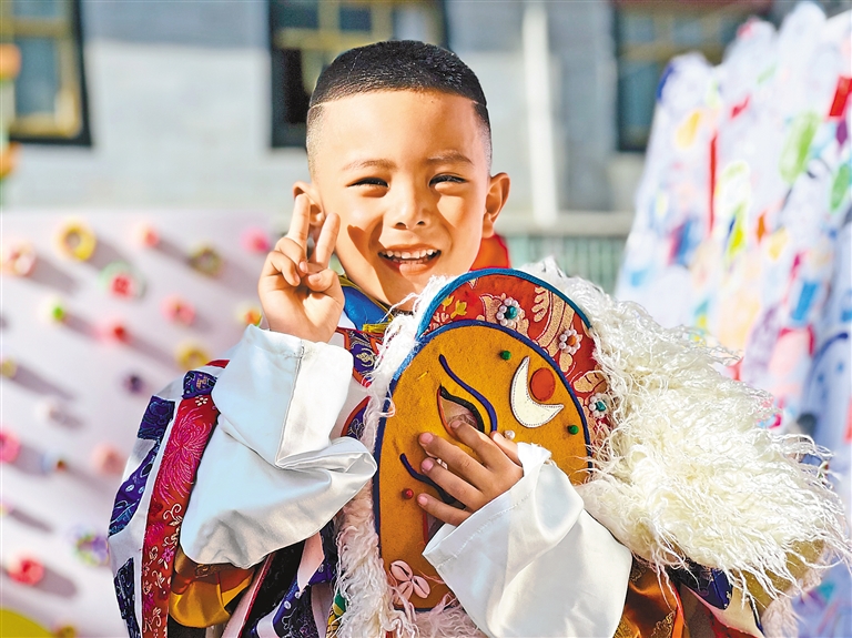 “非遺進(jìn)校園”活動(dòng)中,小朋友戴上藏戲面具,感受非遺文化。記者 格桑倫珠 攝