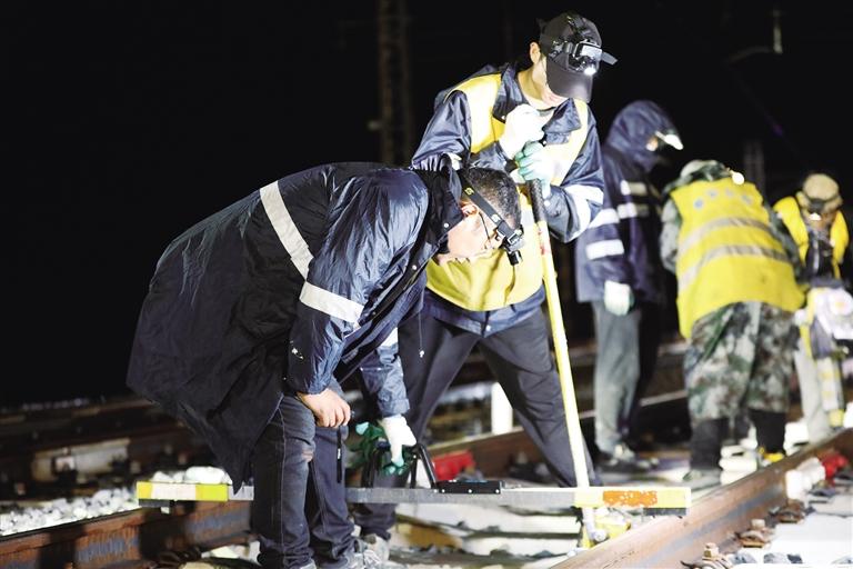 21時30分,作業(yè)中,暴雨傾盆而下,瞬間覆蓋了整個施工現(xiàn)場,噼里啪啦地打在現(xiàn)場作業(yè)人員身上。早已經(jīng)歷過無數(shù)次風(fēng)雨洗禮的他們,握緊手中的工具,按照分工忙碌起來,有的測量數(shù)據(jù)、有的配合作業(yè)、有的檢查設(shè)備、有的盯控安全……整個作業(yè)現(xiàn)場忙而有序,這場突降的暴風(fēng)雨,儼然已成為促使他們奮進(jìn)的鼓點,他們正用昂揚(yáng)的斗志,奏響高原鐵路人的“天路夜曲”。