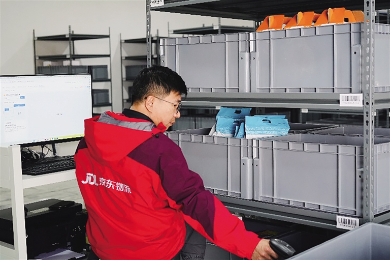 京東物流工作人員在林芝農(nóng)產(chǎn)品前置智能倉內(nèi)揀選貨物。