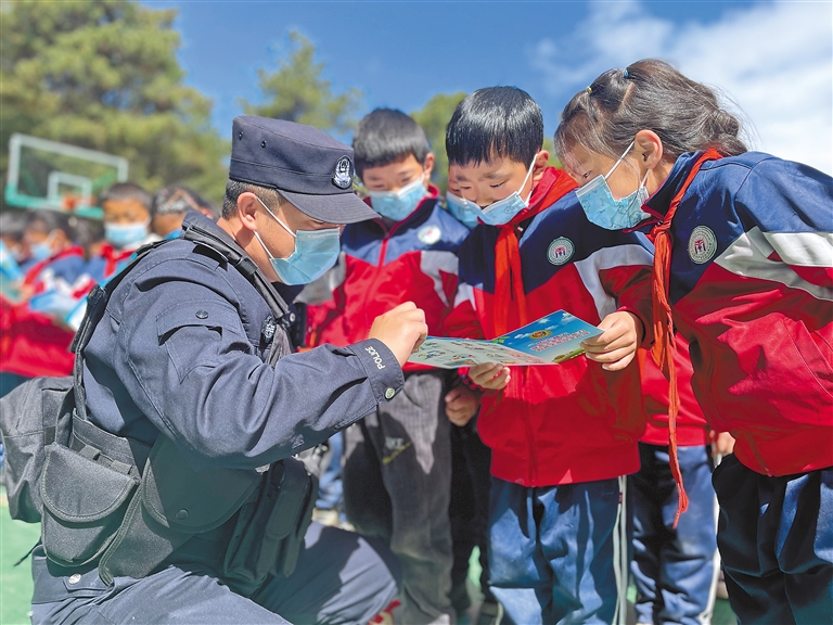 林芝邊境管理支隊南伊邊境派出所副所長趙軍為小學生開展安全宣傳,講解民族團結相關政策。記者 張猛 攝
