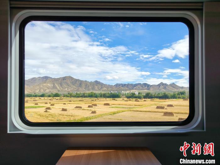 9月23日,從西藏日喀則開(kāi)往拉薩的C886次列車(chē)上望向窗外,是一片豐收堆垛的青稞地。中新社記者 江飛波 攝