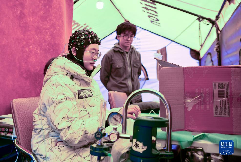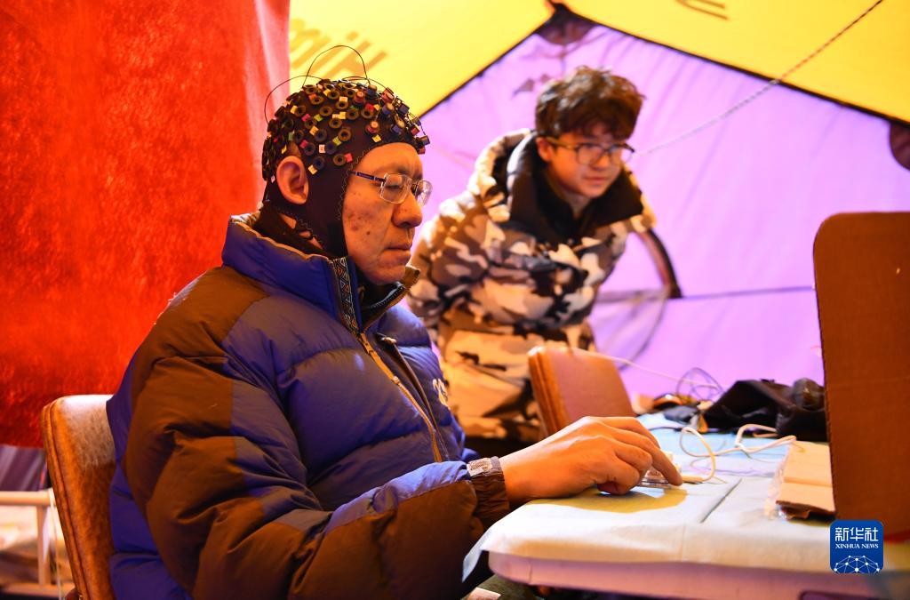 在卓奧友峰登山大本營,科考隊員(前)佩戴全腦彈性測試帽,測試有氧和無氧狀態(tài)下的人體認知能力(9月29日攝)。新華社記者 晉美多吉 攝