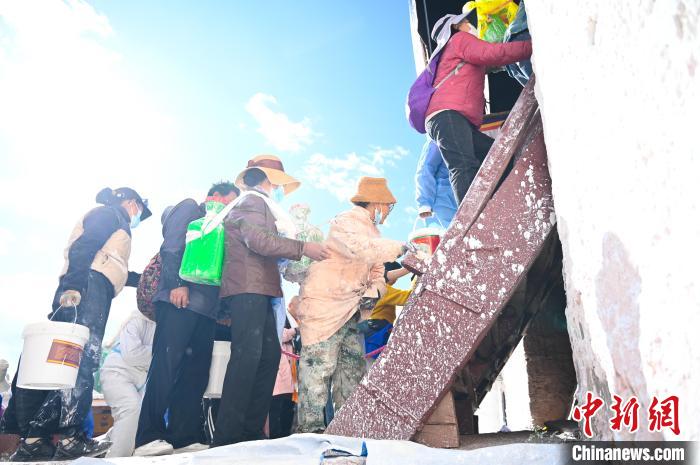 參與到粉刷中的民眾有序運(yùn)送或潑灑涂料???0歲的丹巴渾身沾滿了白色涂料,小憩間盤(pán)腿席地而坐,正在喝甜茶的他,還不忘熱情招呼記者品嘗。這位老人原是布達(dá)拉宮的木匠,工作了28年。退休后,每年布達(dá)拉宮粉刷,他幾乎都要來(lái)參加,覺(jué)得來(lái)布達(dá)拉宮像回家一樣親切。他說(shuō):“以前都是口頭通知喊大家過(guò)來(lái),現(xiàn)在網(wǎng)上一發(fā)消息,大家都主動(dòng)參加?!?/p>