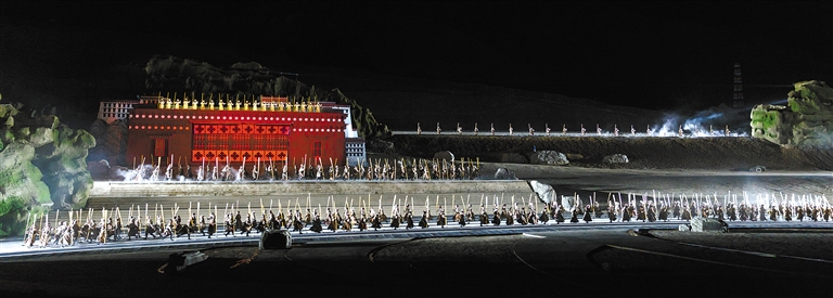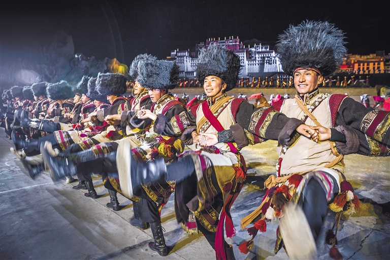 星空為幕,山川為景,氣勢恢宏,震撼心靈。直抵人心的音樂聲響起,歡快的果卓鼓聲震天,熱情的篝火升騰;打阿嘎的搗地之聲,古老藏戲的婉轉(zhuǎn)傳唱,甲諧的豪情奔放……恢弘的布達拉宮布景前,“文成公主”和“松贊干布”穿越千年而來,再現(xiàn)漢藏和美的動人傳奇。
