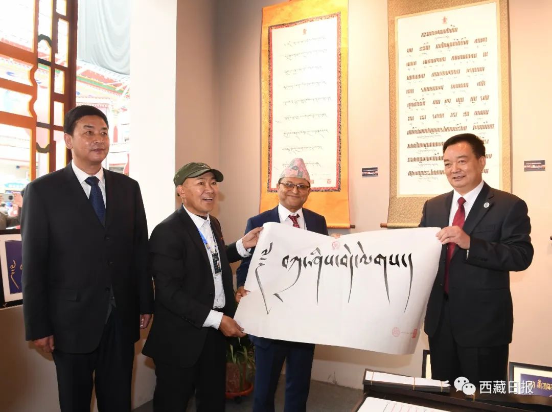這是中國西藏旅游文化國際博覽會期間,王君正向尼泊爾聯(lián)邦院主席加內什·普拉薩德·蒂米爾西納贈送藏文書法作品。記者 李洲 攝