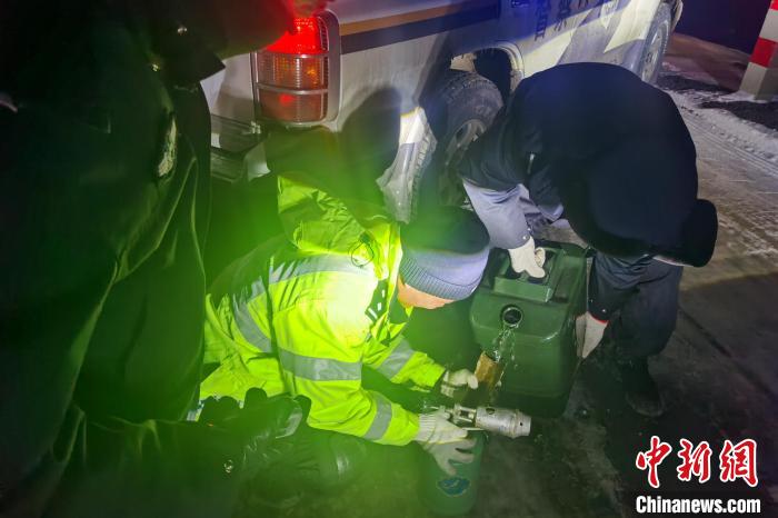 唐古拉山埡口路段入夜后氣溫極低,圖為降雪后安多警方對(duì)被困人員和車輛進(jìn)行施救。安多縣公安局 供圖