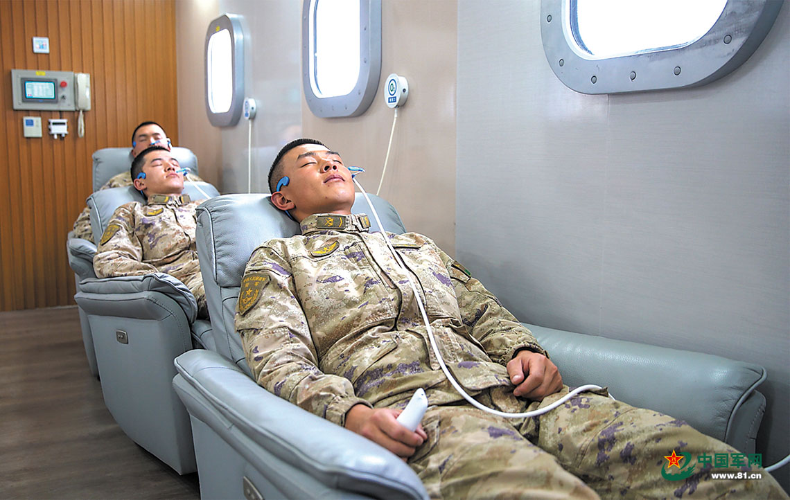 吃好每頓飯,在邊防部隊(duì)已不是新鮮事。對(duì)第一次走上高原的官兵來說,最擔(dān)心的是缺氧。筆者在海拔4700多米的某邊防連看到,剛走下哨位的戰(zhàn)士們進(jìn)入微壓氧艙進(jìn)行休整??戳艘粫?huì)兒書,聽了一會(huì)兒音樂,幾名戰(zhàn)士很快便進(jìn)入夢(mèng)鄉(xiāng)。