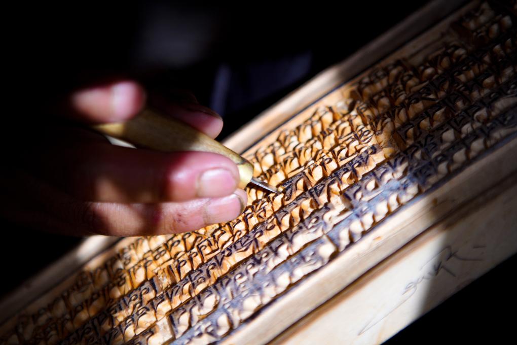 波羅刻版制作并不容易,包括切割、曬油、加固等十多道工序。澤培說:“我們一般選用優(yōu)質(zhì)的紅樺樹,必須要耐磨、沒有裂縫。正式刻制時(shí),每一個(gè)字都必須與模板相對應(yīng),不能跑偏、變形。要想雕刻好,需要熟練掌握藏文書法等相關(guān)知識。一個(gè)字刻壞了,整個(gè)作品就毀了?!?/p>