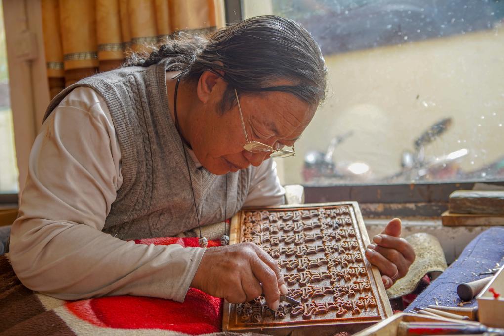 一手緊握刻刀,一手托住木板,刀起刀落間,木屑剝落,一件件樣式精美、色澤瑩潤的雕刻成品躍然眼前。在西藏昌都市江達(dá)縣波羅鄉(xiāng)外沖村,“波羅古澤刻版制作技藝”國家級傳承人澤培正在認(rèn)真指導(dǎo)學(xué)徒制作木刻。