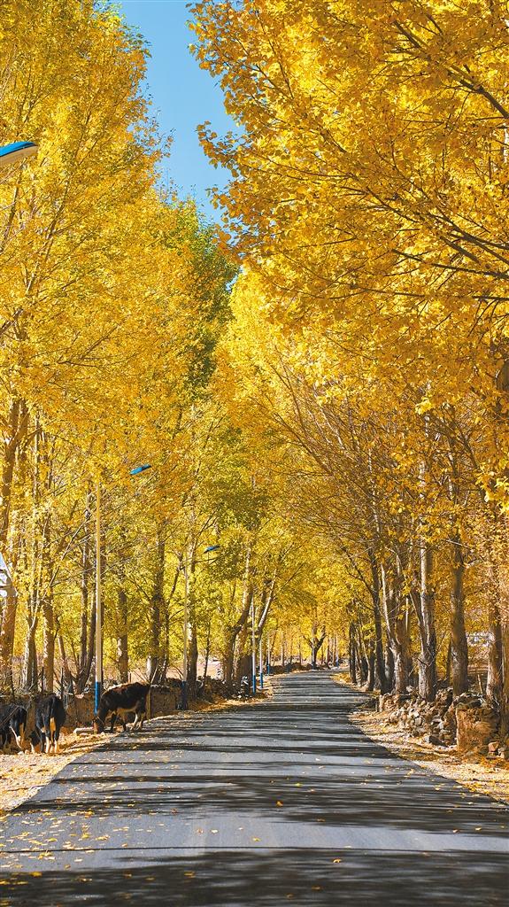不僅如此,不管是往北通向唐嘎鄉(xiāng)的路,還是往南通向章多鄉(xiāng)的路,或是通往各個(gè)村莊的路,都在爭(zhēng)先恐后地訴說(shuō)著金秋的美麗。道路兩旁聳立著金黃色的楊樹,陽(yáng)光透過(guò)樹葉,散落在道路上,一種靜謐而淡然的美,劃過(guò)車窗。