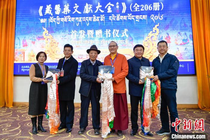 圖為《藏醫(yī)藥文獻(xiàn)大全》贈(zèng)書(shū)儀式現(xiàn)場(chǎng)。貢嘎來(lái)松 攝