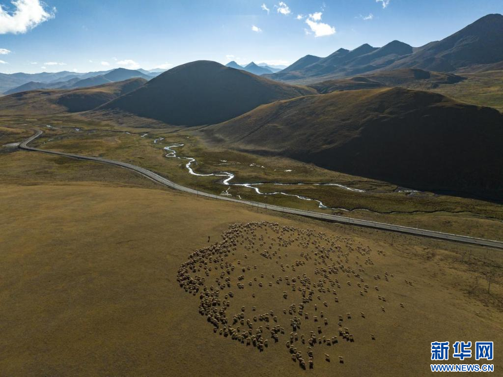 在西藏措美縣境內(nèi)拍攝的羊群(無(wú)人機(jī)照片)。新華網(wǎng) 旦增努布 攝