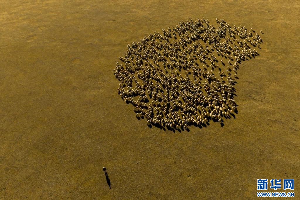 扎西松多村集體養(yǎng)殖的千只綿羊(無(wú)人機(jī)照片)。新華網(wǎng) 旦增努布 攝
