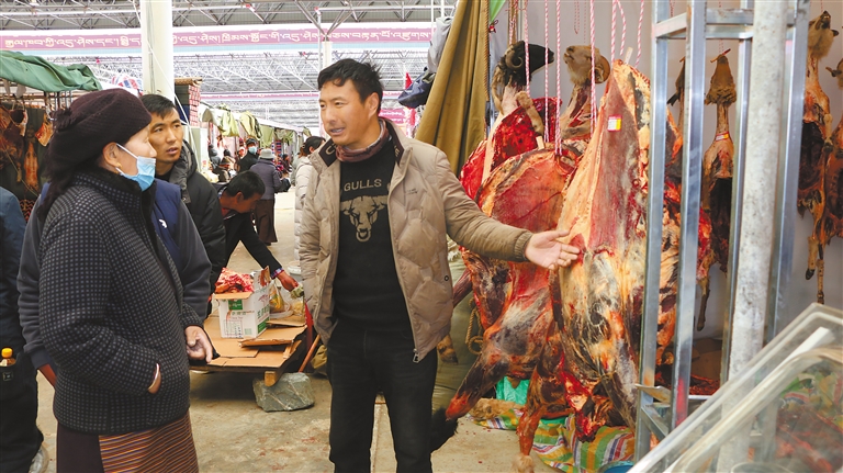 圖為顧客向商家了解牦牛肉價格。
