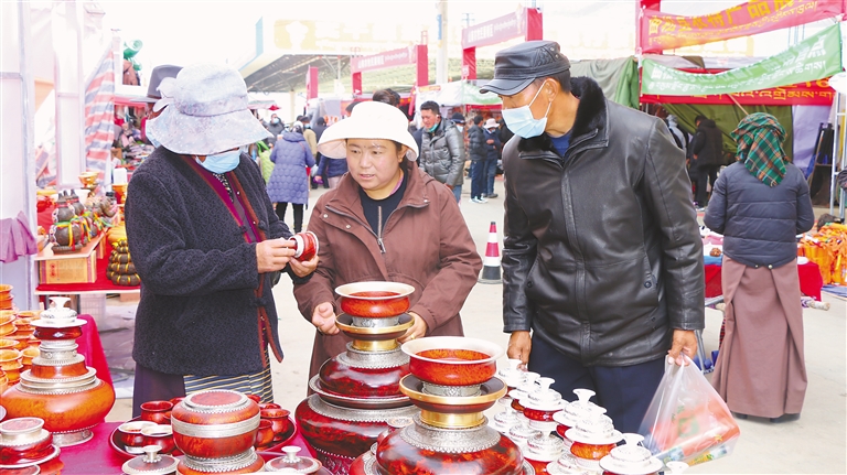 物交會現(xiàn)場,記者看到,各式各樣的特色產(chǎn)品琳瑯滿目,有來自山南市隆子縣熱榮鄉(xiāng)加繞村的牛肚、昌都市江達縣江達鎮(zhèn)的木碗、林芝市工布江達縣的唐卡刺繡……在尼泊爾商家的攤位前,也站滿了眾多市民參觀選購。