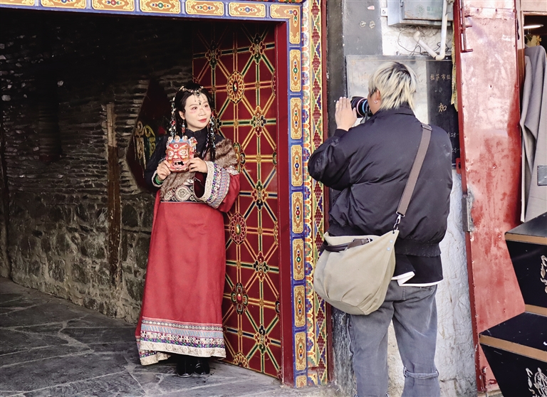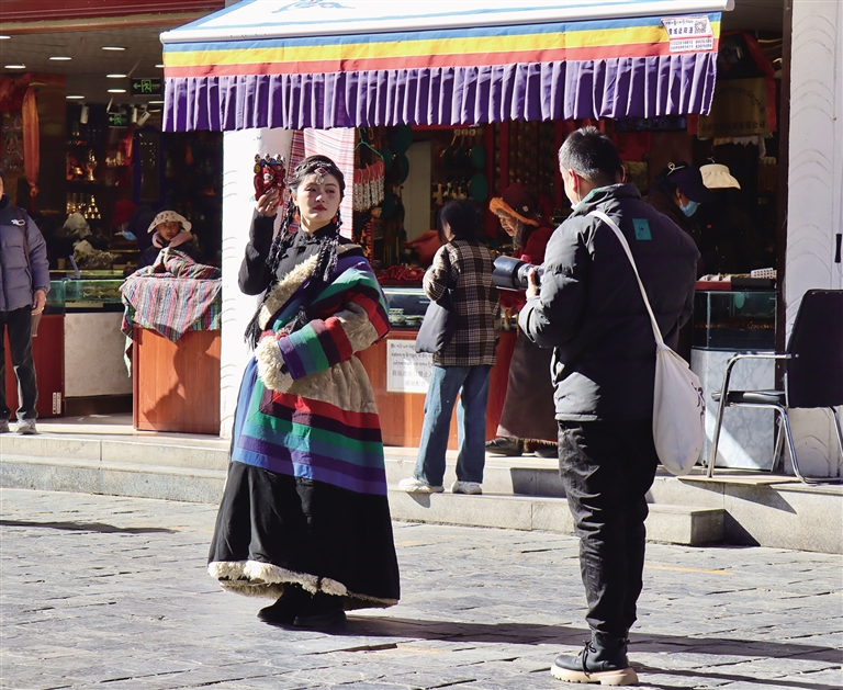 八廓街內體驗藏裝寫真的游客。記者 張琳 攝