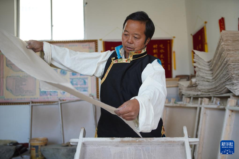 48歲的格桑旦增是“雪拉藏紙制作技藝”傳承人,也是西藏自治區(qū)拉薩市尼木縣雪拉藏紙農(nóng)牧民專業(yè)合作社負(fù)責(zé)人。他世代居住的尼木縣地處高原溫帶半干旱季風(fēng)氣候區(qū),平均每天日照8.3小時(shí)。得天獨(dú)厚的自然條件使其自古以來便是影響較大的藏紙產(chǎn)區(qū)之一。