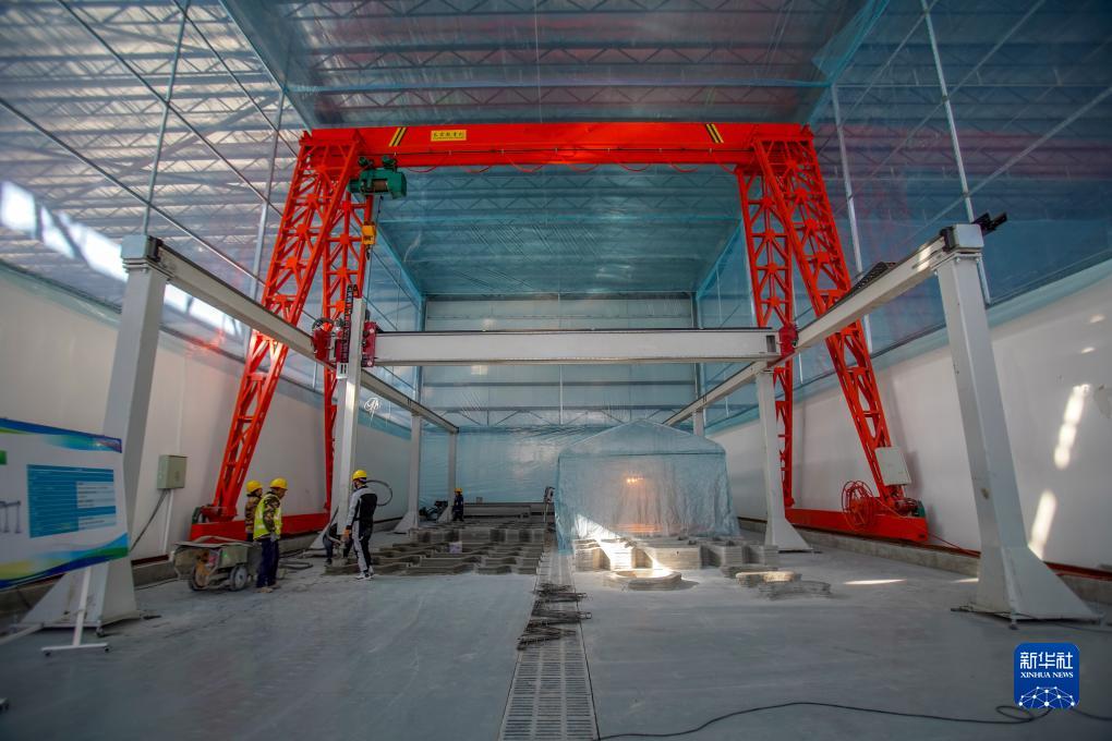工人在一臺(tái)3D打印建筑機(jī)器旁工作(12月12日攝)。新華社記者 劉文博 攝