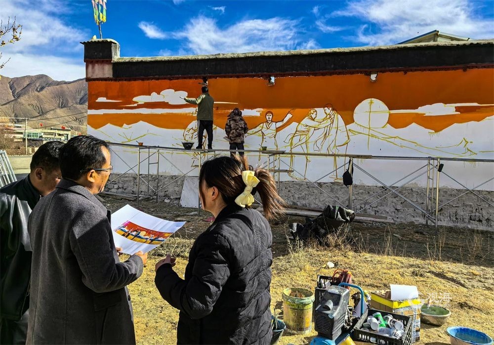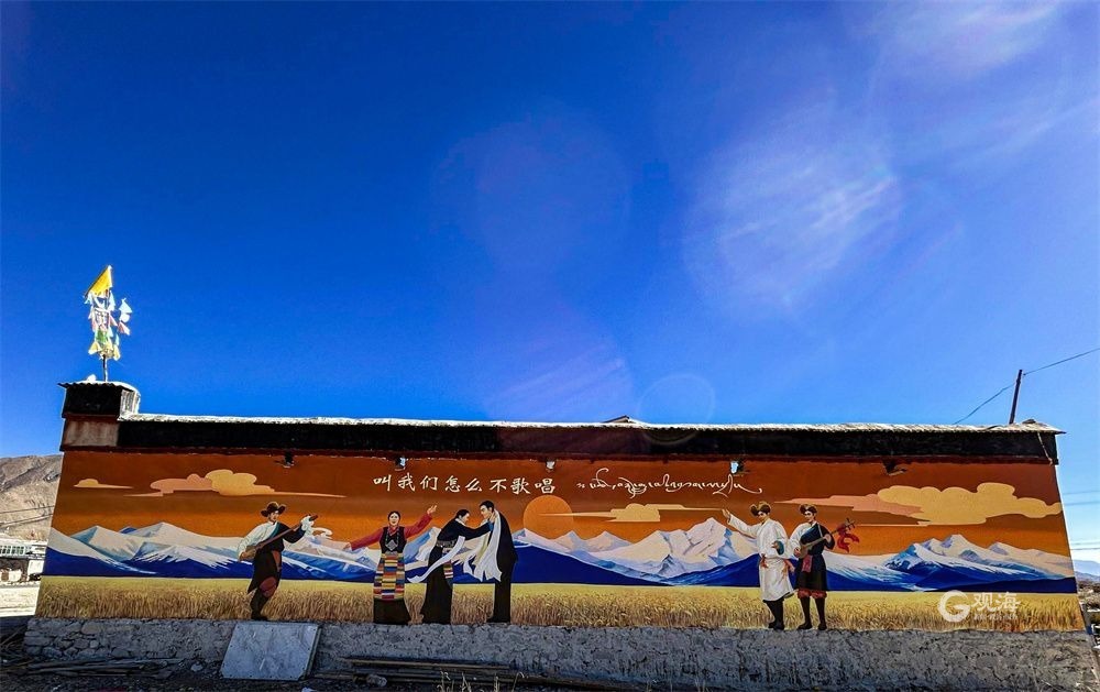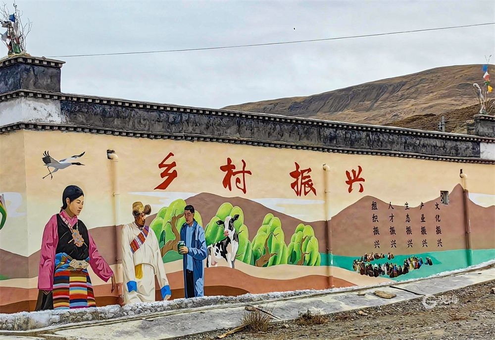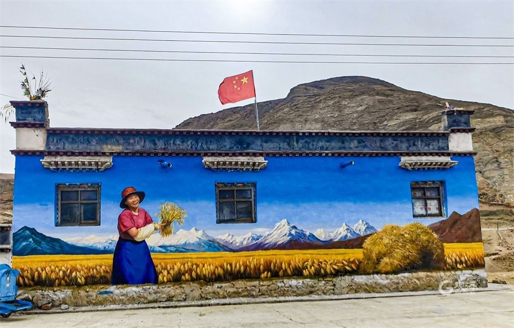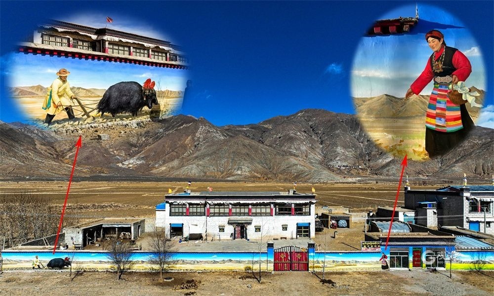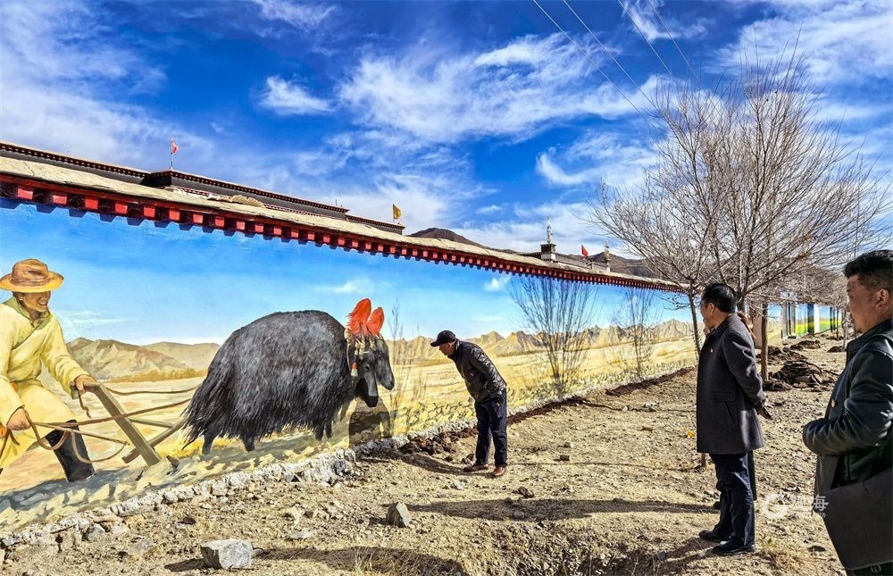 廣袤的高原上,在連綿起伏的山巒之下,是藏族農(nóng)家趕著傳統(tǒng)的“二牛抬杠”耕耘的場景,旁邊的“阿佳”則撒下希望的青稞種子……這樣的場景當然不會出現(xiàn)在現(xiàn)在這個滴水成冰的季節(jié),而是躍然于藏家傳統(tǒng)村居的院墻之上?!拔壹疫@面墻原來就是貼滿了牛糞,現(xiàn)在畫上了我們平時勞動的景象,感覺比之前更好看了?!鄙V樽螀^(qū)東嘎鄉(xiāng)色定村的村民旦瓊說,此前的一年又一年,他都是把牛糞貼在墻上,固然有傳統(tǒng)的高原美感,但是與現(xiàn)在院墻上畫的鄉(xiāng)村振興的場景相比,還是現(xiàn)在的感覺更不錯。