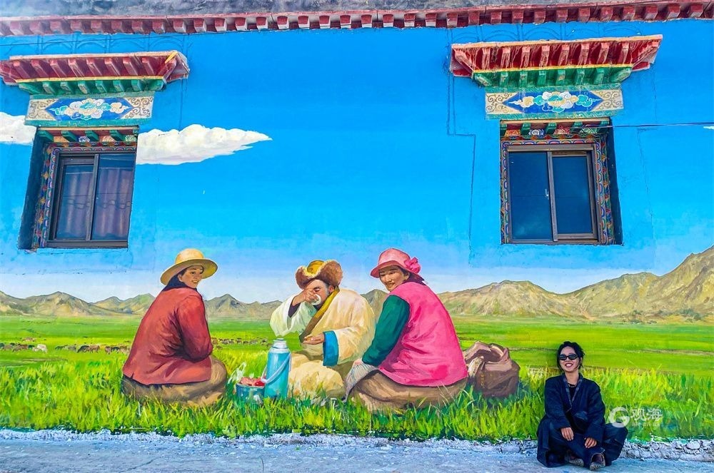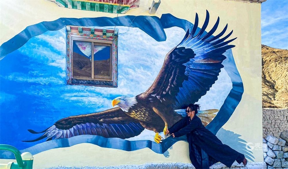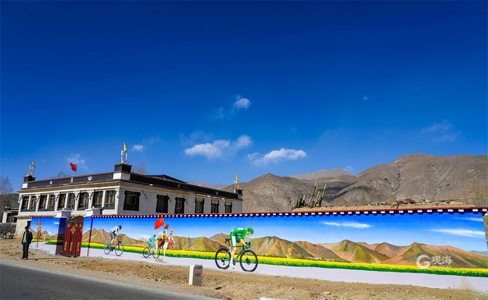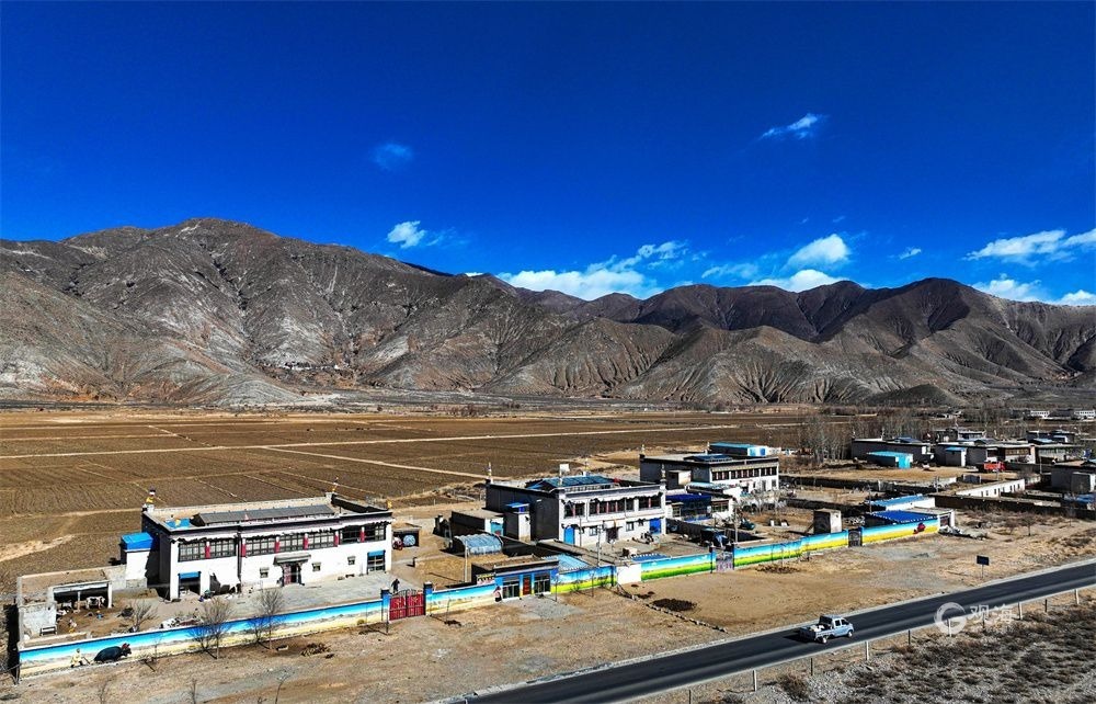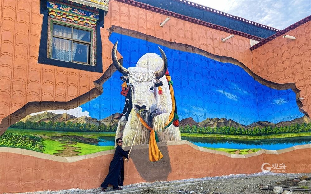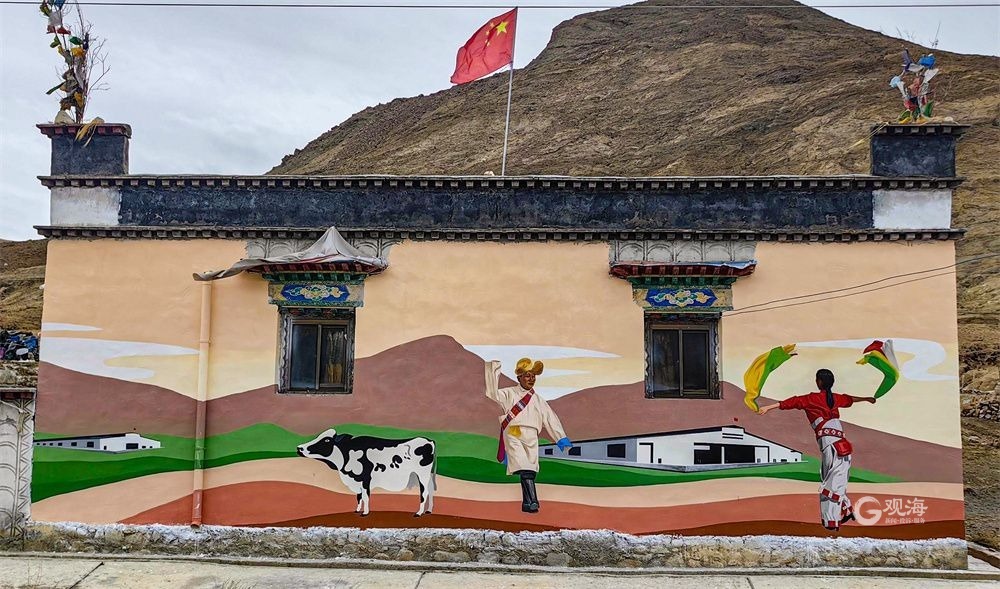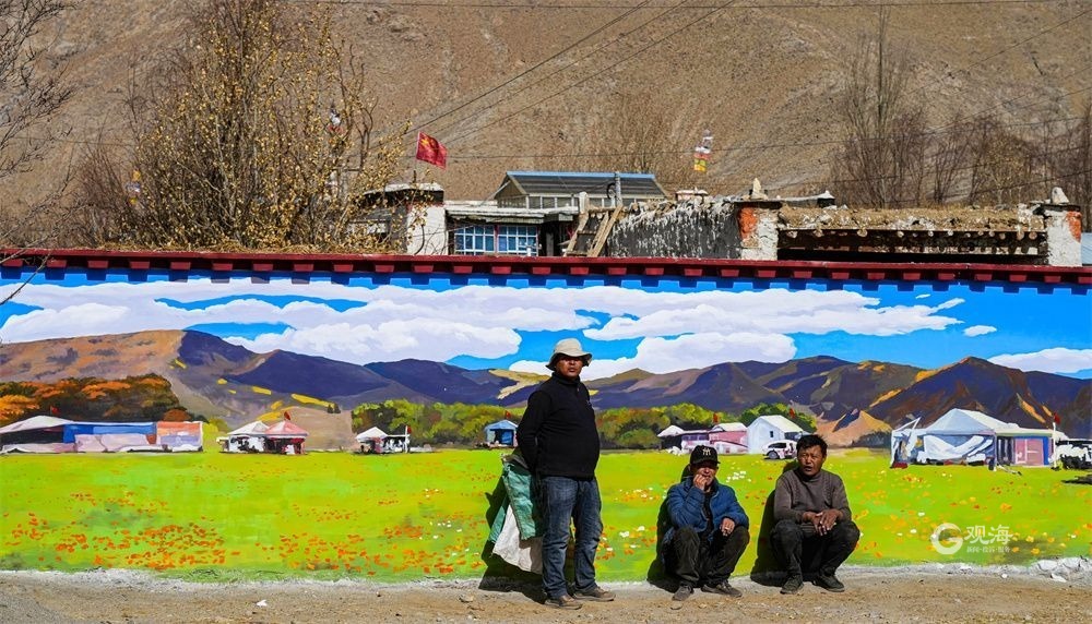 廣袤的高原上,在連綿起伏的山巒之下,是藏族農(nóng)家趕著傳統(tǒng)的“二牛抬杠”耕耘的場景,旁邊的“阿佳”則撒下希望的青稞種子……這樣的場景當然不會出現(xiàn)在現(xiàn)在這個滴水成冰的季節(jié),而是躍然于藏家傳統(tǒng)村居的院墻之上?!拔壹疫@面墻原來就是貼滿了牛糞,現(xiàn)在畫上了我們平時勞動的景象,感覺比之前更好看了?!鄙V樽螀^(qū)東嘎鄉(xiāng)色定村的村民旦瓊說,此前的一年又一年,他都是把牛糞貼在墻上,固然有傳統(tǒng)的高原美感,但是與現(xiàn)在院墻上畫的鄉(xiāng)村振興的場景相比,還是現(xiàn)在的感覺更不錯。