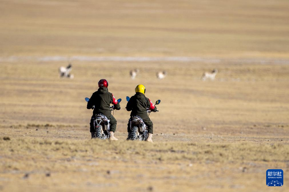 在羌塘國家級(jí)自然保護(hù)區(qū),野生動(dòng)物管護(hù)隊(duì)員騎著摩托車觀察藏羚羊(12月17日攝)。新華社記者 姜帆 攝