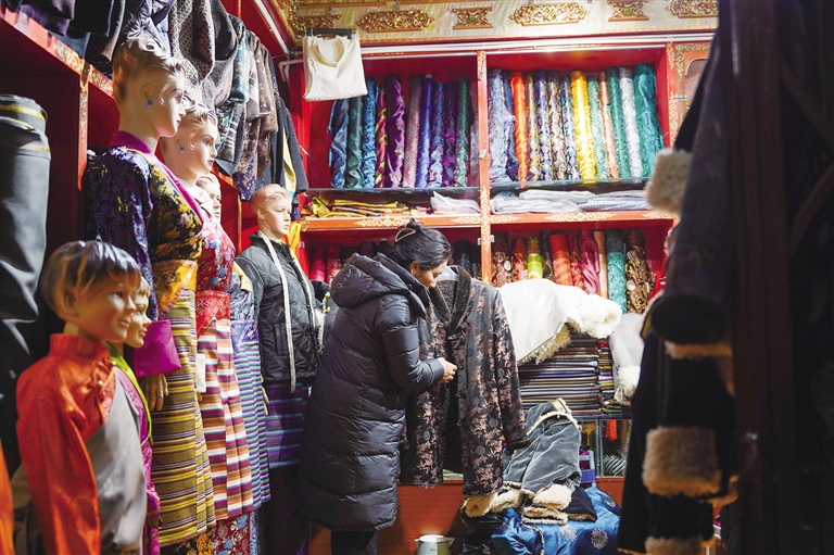 “最近越來越冷了,所以我今天來給女兒買一件厚點的藏裝,剛好她生日也快到了。”走進位于北京東路的222藏裝店,琳瑯滿目、顏色絢麗的冬款藏裝讓人眼前一亮,市民尼瑪拉姆正在給女兒挑選藏裝。一旁,店員則在給客人測量三圍、取藏裝、介紹款式,忙得不可開交。