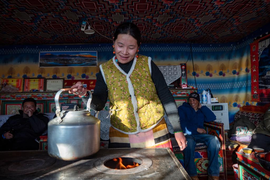俄久鄉(xiāng)馬遷村嘎宗的家中明亮整潔,過冬的厚衣服摞在座椅上。將牛糞投入爐子中點燃,屋里的溫度逐漸升高。燒一壺熱水,喝一杯熱茶,屋外茫茫草原上的狂風,頓時變得不再可怕。嘎宗和女兒圍坐在爐邊,露出了笑容。