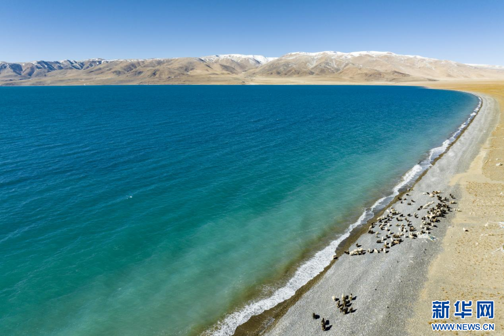 12月20日拍攝的當(dāng)惹雍錯(cuò)湖畔的羊群(無人機(jī)照片)。新華網(wǎng) 旦增努布 攝