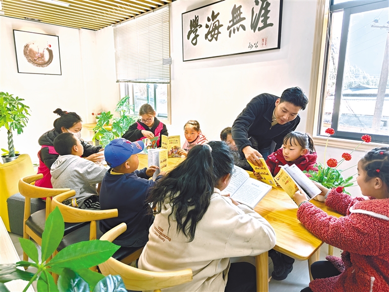 新時(shí)代文明實(shí)踐志愿服務(wù)隊(duì)成員在扎拉村農(nóng)家書屋輔導(dǎo)孩子閱讀書籍。謝筱純 王珊 攝