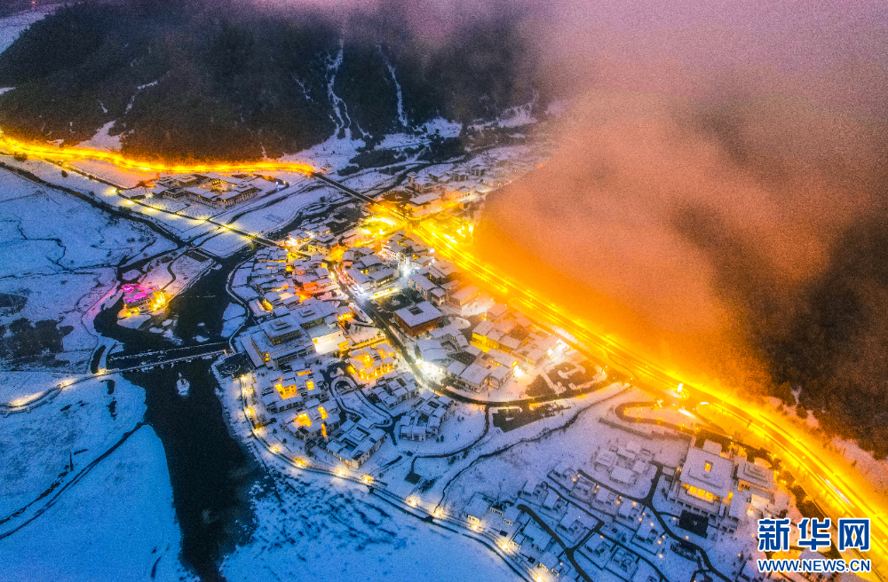 圖為1月3日夜幕初始的魯朗國(guó)際旅游小鎮(zhèn)(無人機(jī)照片)。新華網(wǎng)發(fā) 姚力 攝