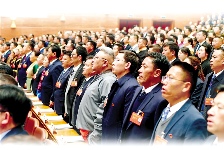 圖為西藏自治區(qū)人大代表們齊唱國歌。 記者 潘多 攝
