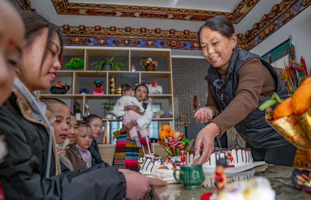 1月8日,愛心媽媽巴桑給孩子們分發(fā)蛋糕。新華社照片,拉薩,2024年1月9日 新華社發(fā)(丁增尼達(dá)攝)