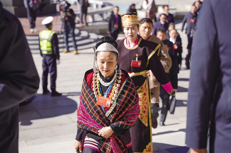 身著民族服飾的人大代表步入閉幕會(huì)場。