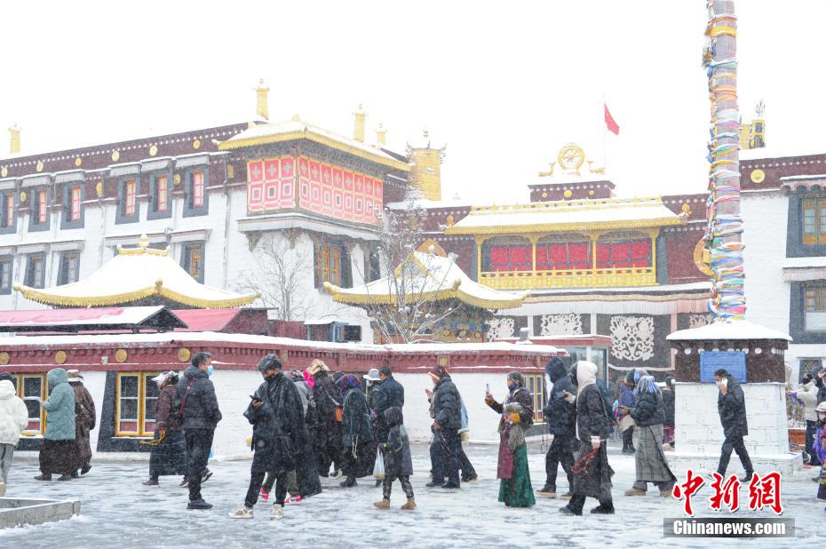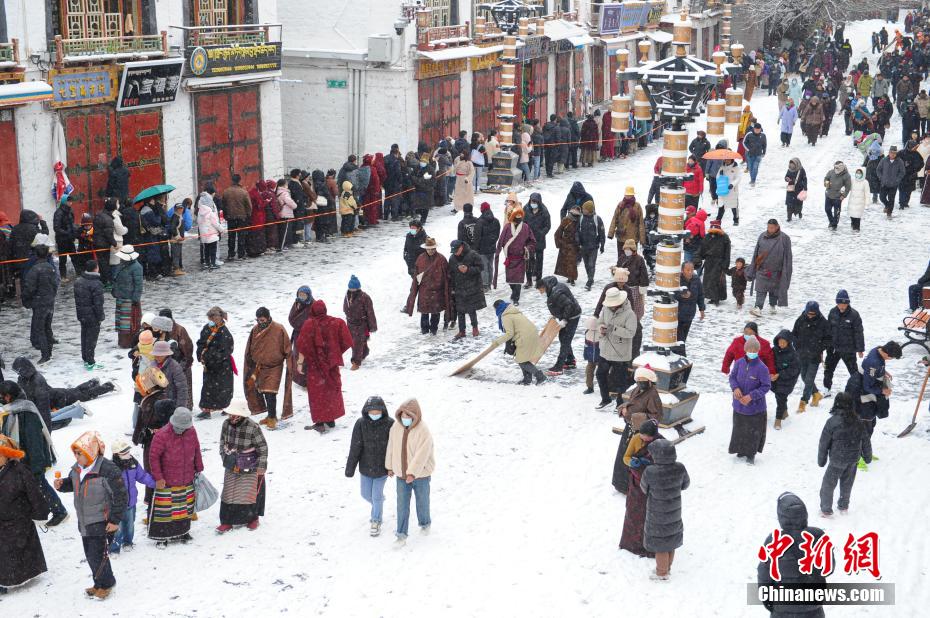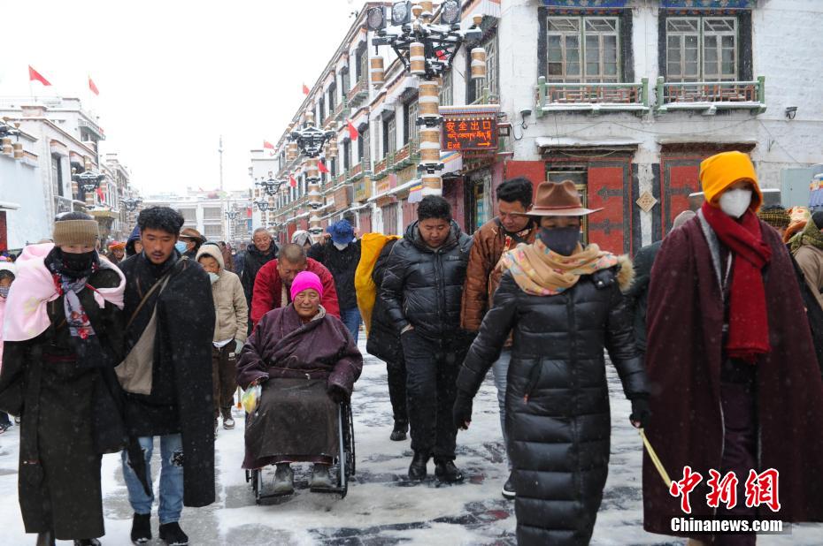 圖為雪后信眾在拉薩市大昭寺前朝拜。